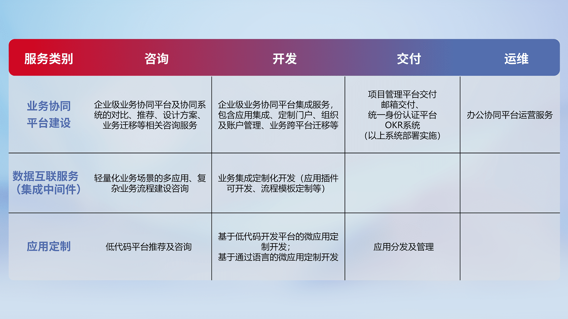针对钉钉、、、企微、、IDaas等平台级产品提供产品的规划、、方案、、、、交付、、、定制化开发等服务,,,实现如统一协同办公、、、智能客户服务、、、混合会议管理、、智能数据查询、、等业务场景,,实现数字化转型。。。
